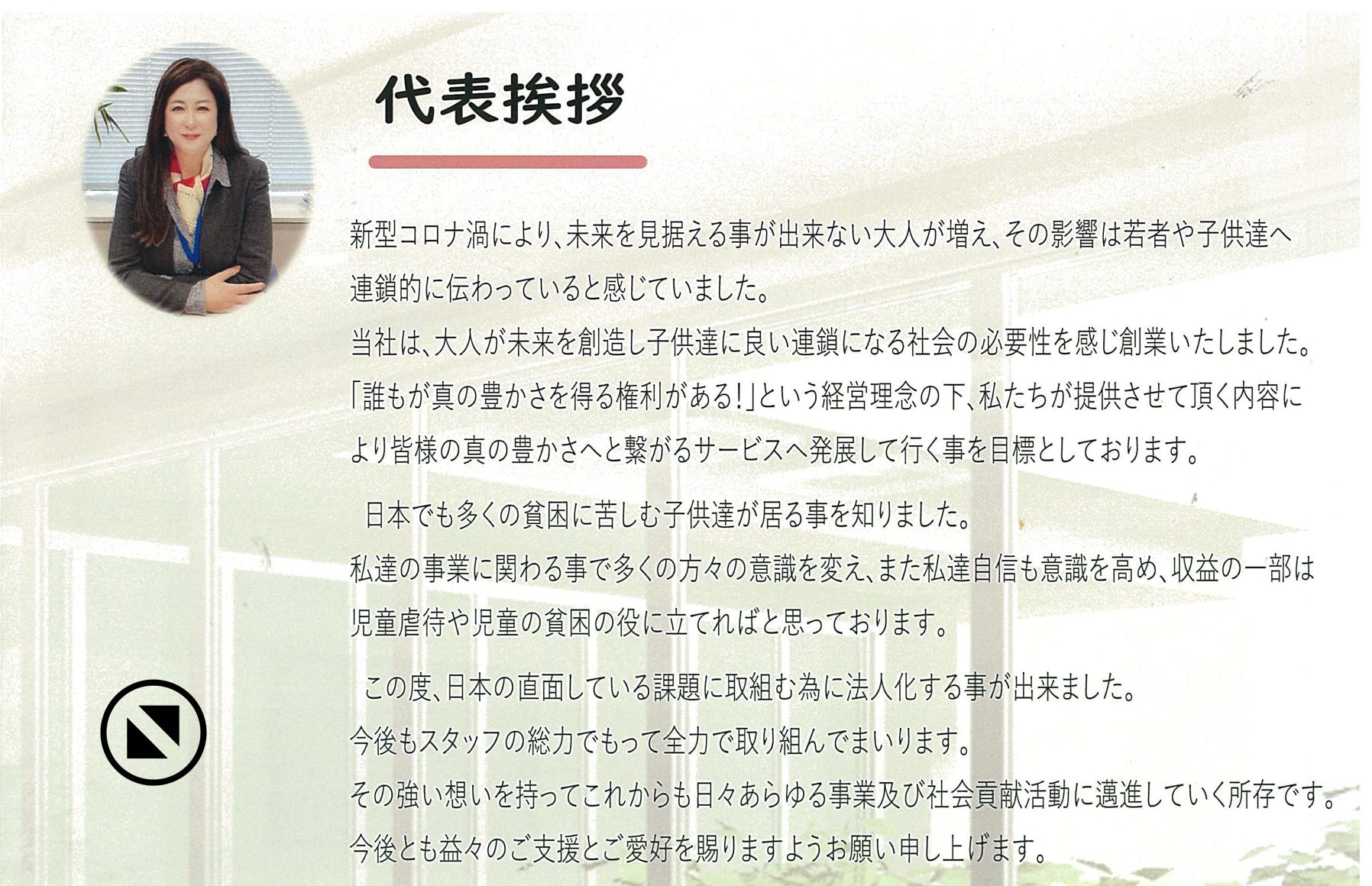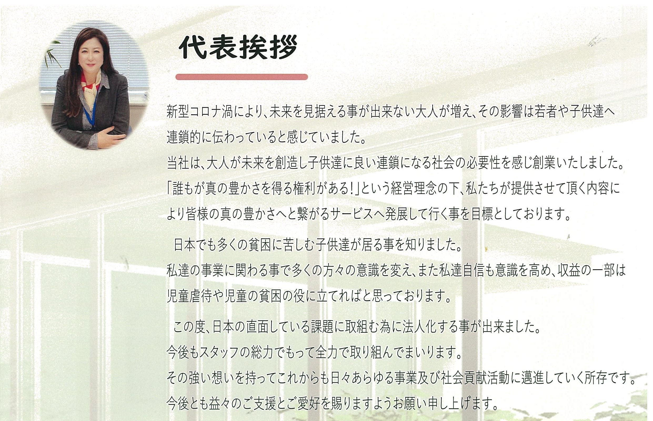 We are a consulting company that helps people to feel more fulfilled in their lives. We are committed to helping companies as well as individuals to overcome the current economic situation in Japan, where children are suffering from poverty and uncertainty about the future, and to help eliminate the poor.